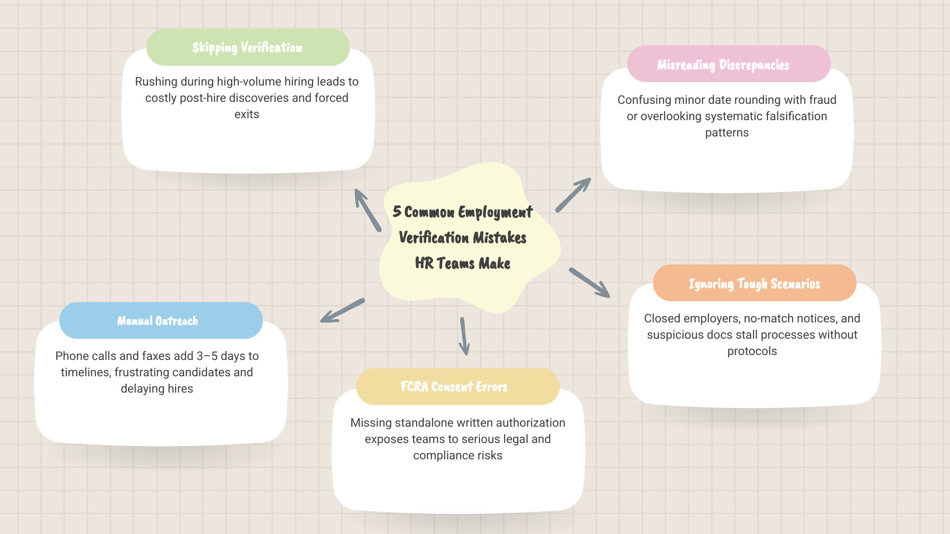 - Skipping verification during high-volume surges, leading to costly post-hire exits.