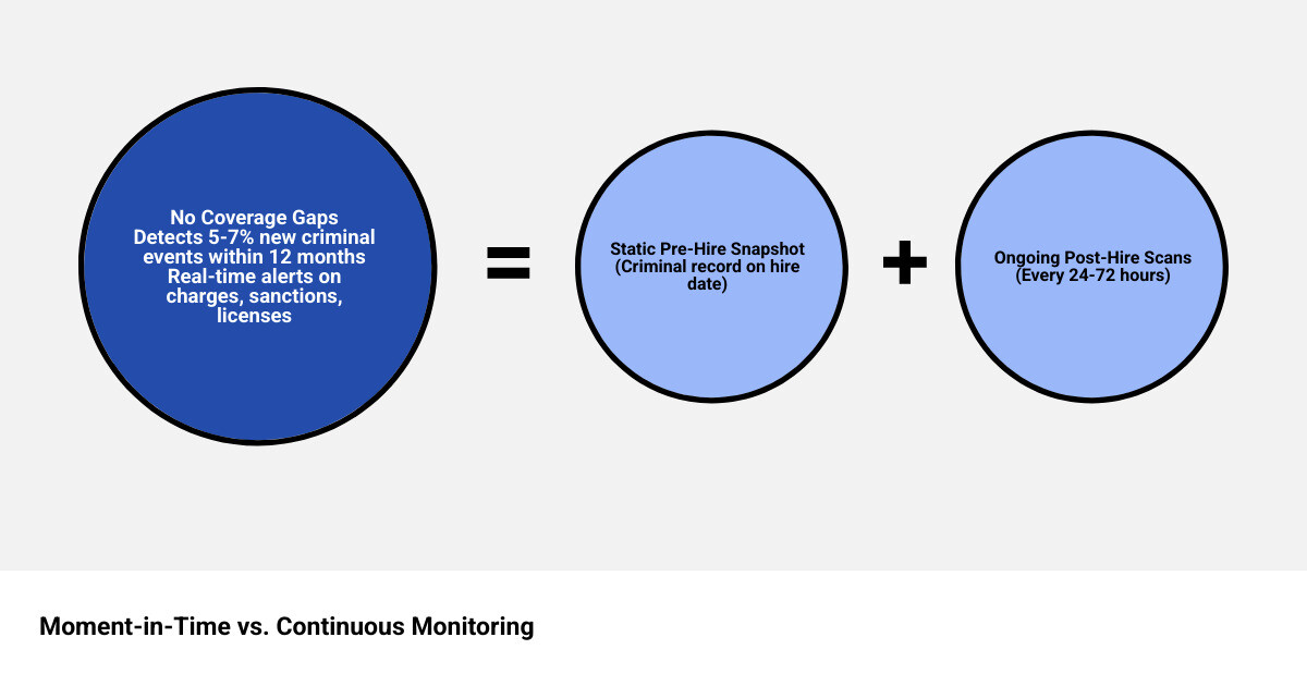 That snapshot starts aging the moment you extend an offer. Research suggests that 5–7% of employees experience a reportable criminal event within 12 months of being hired. For a workforce of 1,000 people, that is potentially 50–70 incidents your team would never know about without ongoing screening in place.